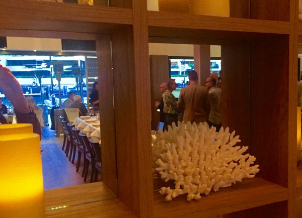 S. T. UDIO head Sally Taylor was entasked with interpreting that brief, which she has done via shadow boxes of coral and warm golden candles, raw oaks, a wall of strategically placed bottles of wine (there’s a keen new sommelier in Christian Denier), which will have chalked captions as soon as someone finds the chalk, floor to ceiling curtains delineating private spaces and a bar embellished with soft gold mother-of-pearl “scales”.