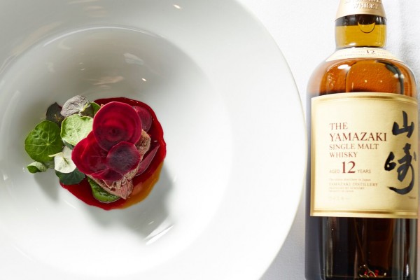 Elegant loin of venison is accompanied by beetroot cooked in pepperberries with honey and orange, paired with the deep yet delicate Yamazaki 12-year-old single malt which looks shot through with gold.