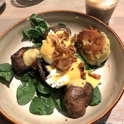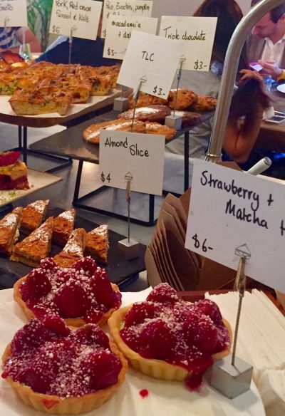 Generous strawberry tarts are anchored with matcha green tea cream; portobello mushrooms pack down with potato and gruyere rosti; thick-cut slabs of bacon come with black beans, eggs and feta, and – get this – choc-chip cookies are baked to order.