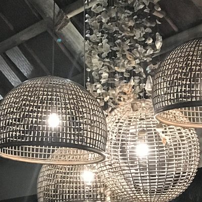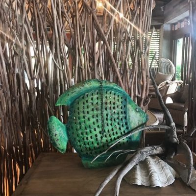 In a workshop destined to become the chicken coop, Ako has been overseeing an impressive body of work that incorporates driftwood, shells, washed-up coral, building off-cuts and husks in the making of everything from signature shell wind chimes, to 6m tall installations and sculptures, to wall-width fish murals, lamp stands, occasional tables, signage, souvenirs, and serving platters.